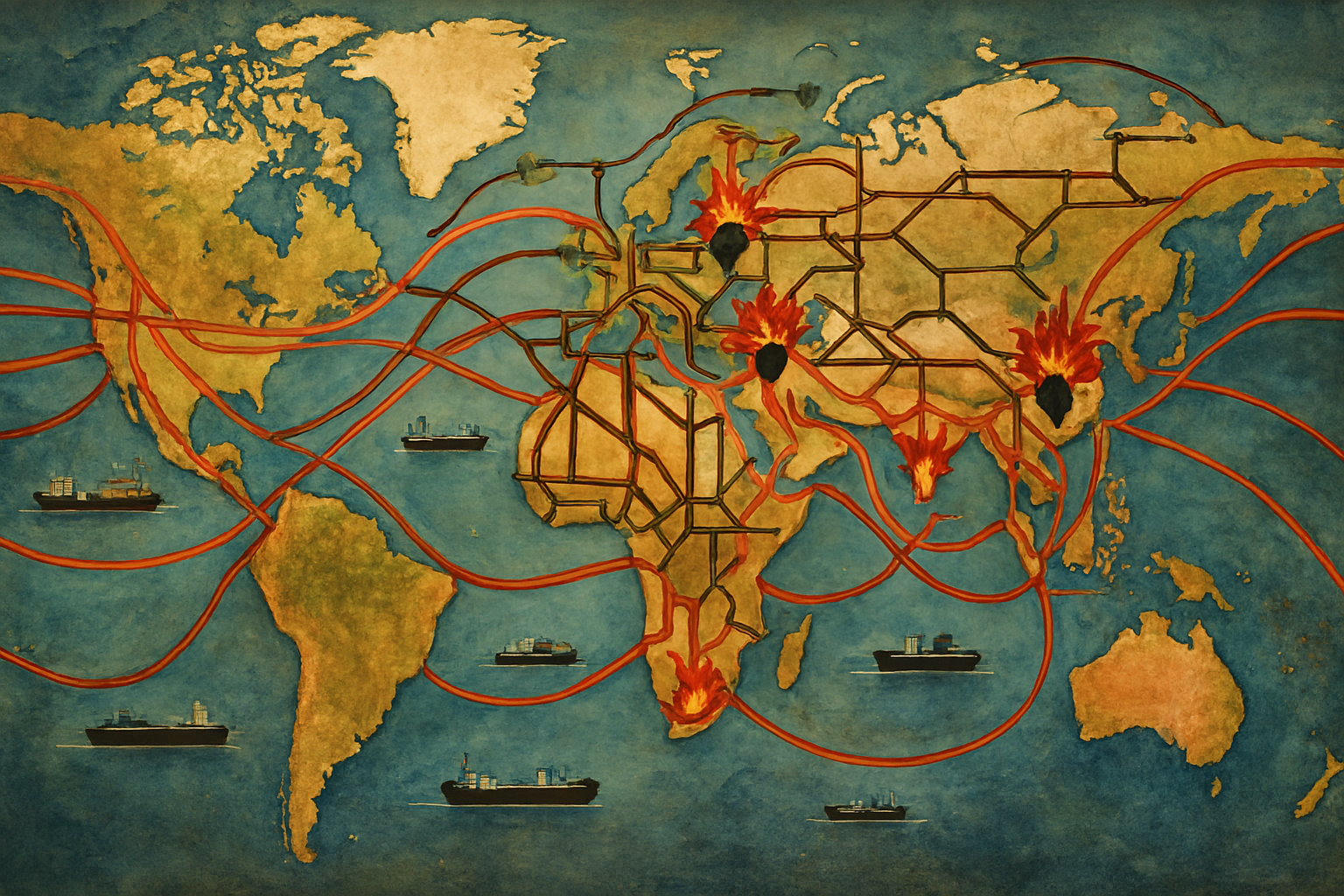- Thin gold arcs for emerging trade corridors (Central Asia–Middle East, Africa–India, Latin America–Africa).